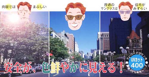 従来のドライブサングラスはブラウン、イエロー、ピンク等を透過し、他の色を遮る方法、可視域全体を適当に遮るニュウトラルガラスを利用する方法、特定の金属膜をコートする方法、ホトミックグラスを利用する方法等があった。